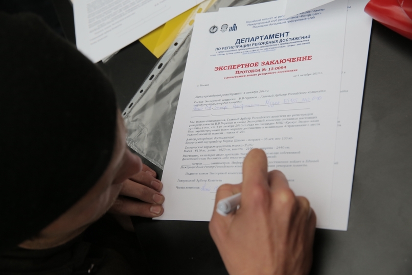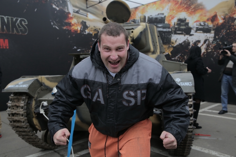 Человек против танка 4-го октября 2013-го года на площадке МВЦ «Крокус Экспо» нами было зарегистрировано новое мировое достижение в номинации «Страгивание с места тяжелой военной техники – танка «Т-26». Автор рекордного достижения: белорусский пауэрлифтер Кирилл Шимко – возраст – 35 лет, вес 130 кг. Технические характеристики танка «Т-26»: Масса - 8116 кг, длина - 4620 см, высота - 2190 см, ширина - 2440 см. Расстояние, на которое атлет протащил танк «Т-26» при помощи собственной физической силы без каких-либо технических приспособлений: 5 метров 26 сантиметров. Информация о данном достижении войдет в Единый Международный Реестр Российского комитета по регистрации рекордов планеты. |