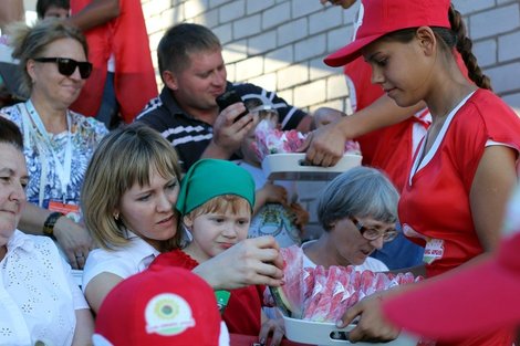Самое массовое единовременное поедание арбузов В Соль-Илецке установлен рекорд коллективного единовременного поедания арбуза. 1212 соль-илечан и участников IX Межрегионального фестиваля «Соль-Илецкий арбуз» и III Международного форума «Сельский туризм в России» одновременно отведали сладкую сочную ягоду. Почти пятьдесят волонтёров одновременно вынесли на подносах аккуратно упакованные дольки арбуза. За соблюдением всех условий и правил следили прибывшие из Москвы главный арбитр российского комитета по регистрации рекордов планеты Вадим Горюнов и вице-президент Международного клуба рекордсменов "Интерстронг" Виктор Овсянников. В экспертном заключении сказано: "22 августа 2014 года на стадионе "Юность" города Соль-Илецка нами было зарегистрировано новое национальное достижение, достойное занесения во всемирное издание "Книги рекордов Гиннеса", в номинации "Самое массовое в России единовременное поедание арбузов". Автор рекордного достижения: муниципальное образование Соль-Илецкий район Оренбургской области. Информация о данном достижении войдёт в Единый Международный Реестр Российского комитета по регистрации рекордов планеты". После подведения итогов исполняющий обязанности губернатора Оренбургской области Юрий Берг, исполняющий обязанности первого вице-губернатора Сергей Балыкин, директор исполнительной дирекции Оренбургского областного союза промышленников и предпринимателей Вячеслав Лагуновский, глава Соль-Илецкого района идейный вдохновитель мероприятия Юрий Вдовкин получили соответствующие сертификаты и памятный знак. – Все мы ещё много лет будем с удовольствием есть замечательный соль-илецкий арбуз, – приветствовал гостей Юрий Георгиевич Берг. |