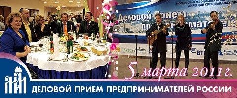 Деловой Прием предпринимателей России 5 марта 2011 года Московская Ассоциация предпринимателей 5 марта 2011 года в Универсальном зале Правительства Москвы провела Деловой Прием предпринимателей России, посвященный празднованию Международного Женского Дня. Мероприятие явилось ярким весенним событием года в деловых кругах Москвы. В праздничном вечере приняли участие более двухсот пятидесяти гостей, среди которых были представители правительства Москвы, общественных организаций, генеральные директора и ведущие специалисты компаний Москвы и регионов России. В фойе всех гостей встречала музыка Нелли Шахраманян, уникального современного композитора и автора-исполнителя фортепианной и электронной музыки. Музыка Нелли Шахраманян - это и романтическая классика, и космическая лирика, легкая медитация и размышления, мечты и исцеление через звук! Компания «Конфаэль» перед началом банкета провела для гостей интересный конкурс – шоколадное рисование. Все желающие могли нарисовать шоколадными красками на шоколадных плитках рисунки, написать поздравления с праздником 8 марта для своих любимых и близких, а чуть позже, когда шоколад застыл, забрать себе в подарок свои удивительные шедевры. Всех присутствующих дам порадовал партнер мероприятия компания МейТан. Натуральная китайская косметика МейТан - это уникальный на российском рынке продукт. Вся косметика разработана и создана по принципу сочетания знаний древней китайской медицины, открытий и новейших достижений в области химии, биологии, медицины, косметологии, фармакологии. Все дамы имели возможность испробовать эту удивительную косметику на себе, и никто не остался к ней равнодушным. Фирма «ВИП БИ» представила изделия из натурального камня. Основной материал выпускаемой продукции - обсидиан, «камень-Учитель», камень-оберег, по поверью наших предков, охраняющий человека от дурного глаза и от совершения плохих поступков. Все работы выполнены вручную. Созданию некоторых изделий художник по камню посвящает до месяца кропотливой, творческой, высококвалифицированной работы. Вот почему фигурка из обсидиана хранит в себе не только душу камня, но и тепло рук человека, придавшего этому камню изящную и причудливую форму. Удивительно красивую выставку для предпринимателей организовали компания «СолоДомДекор» и бренд «РУССКИЕ САМОРОДКИ». СолоДомДекор - один из крупнейших в России производителей постеров и репродукций в рамах, настенных ключниц и аптечек. Эксклюзивные ювелирные изделия с самородками, ювелирные украшения из белого и традиционного золота, колье и подвески с бриллиантами, цепи, браслеты, броши, – стопроцентный эксклюзив от компании «РУССКИЕ САМОРОДКИ» Официальную часть Приёма открыл президент Московской Ассоциации предпринимателей Андрей Евгеньевич Поденок. Он поздравил всех присутствующих дам с Международным женским праздником, и пожелал всем собравшимся весеннего настроения. Далее состоялась торжественная церемония вручения дипломов Ассоциации всем женщинам руководителям за успехи в предпринимательской деятельности. Для собравшихся на протяжении всего вечера со сцены выступали: заслуженный артист России Владимир Михайлов, шоу-группа «9.1.1», Ульянова Анна, шоу-группа «Модуль», Илья Мамонов и другие. У гостей была возможность попробовать эксклюзивн