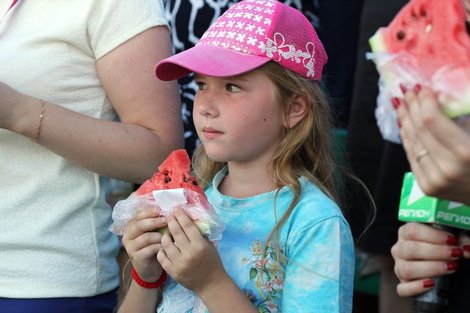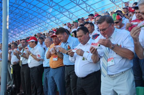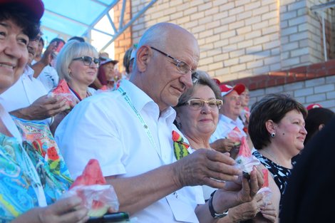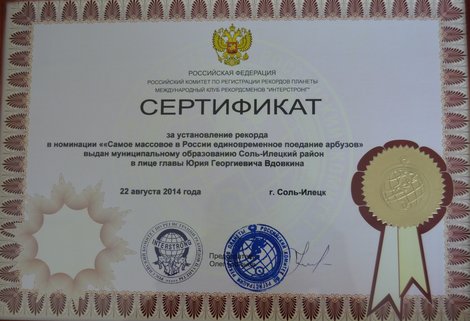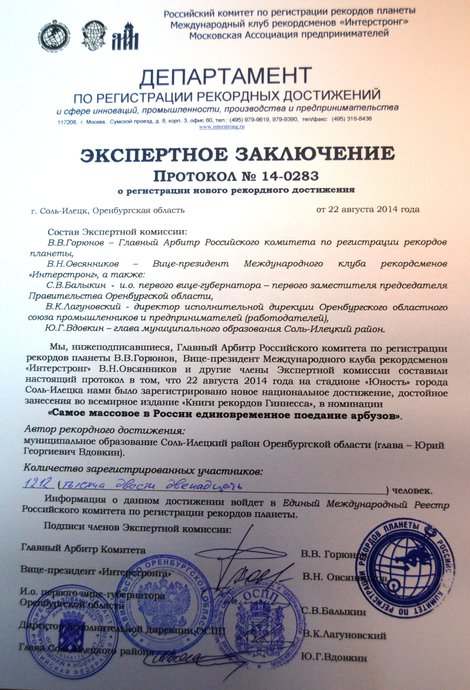 Самое массовое единовременное поедание арбузов В Соль-Илецке установлен рекорд коллективного единовременного поедания арбуза. 1212 соль-илечан и участников IX Межрегионального фестиваля «Соль-Илецкий арбуз» и III Международного форума «Сельский туризм в России» одновременно отведали сладкую сочную ягоду. Почти пятьдесят волонтёров одновременно вынесли на подносах аккуратно упакованные дольки арбуза. За соблюдением всех условий и правил следили прибывшие из Москвы главный арбитр российского комитета по регистрации рекордов планеты Вадим Горюнов и вице-президент Международного клуба рекордсменов "Интерстронг" Виктор Овсянников. В экспертном заключении сказано: "22 августа 2014 года на стадионе "Юность" города Соль-Илецка нами было зарегистрировано новое национальное достижение, достойное занесения во всемирное издание "Книги рекордов Гиннеса", в номинации "Самое массовое в России единовременное поедание арбузов". Автор рекордного достижения: муниципальное образование Соль-Илецкий район Оренбургской области. Информация о данном достижении войдёт в Единый Международный Реестр Российского комитета по регистрации рекордов планеты". После подведения итогов исполняющий обязанности губернатора Оренбургской области Юрий Берг, исполняющий обязанности первого вице-губернатора Сергей Балыкин, директор исполнительной дирекции Оренбургского областного союза промышленников и предпринимателей Вячеслав Лагуновский, глава Соль-Илецкого района идейный вдохновитель мероприятия Юрий Вдовкин получили соответствующие сертификаты и памятный знак. – Все мы ещё много лет будем с удовольствием есть замечательный соль-илецкий арбуз, – приветствовал гостей Юрий Георгиевич Берг. |