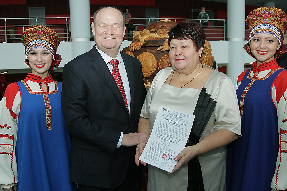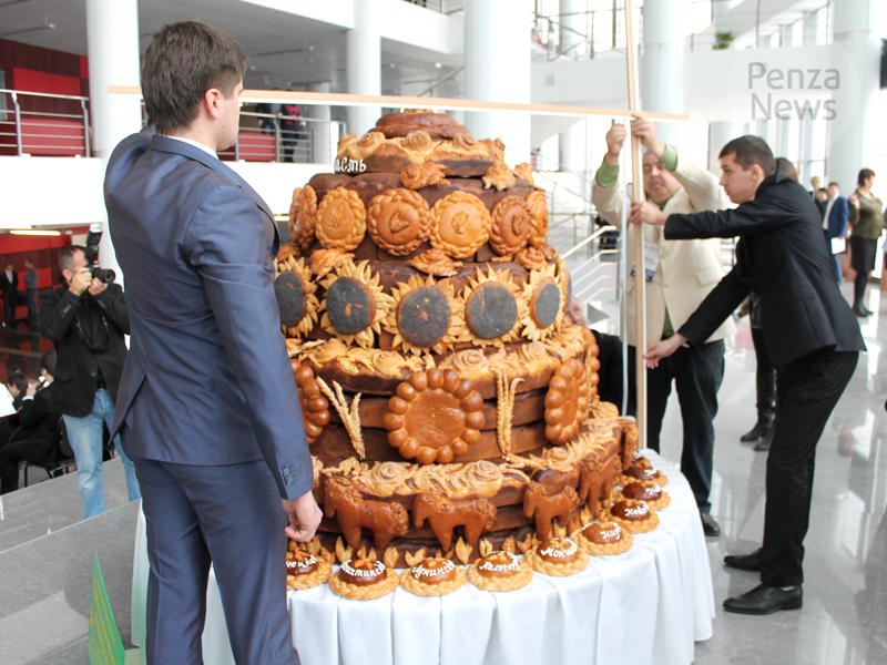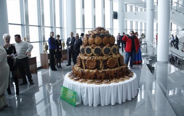 Самый большой каравай Гигантский каравай с изюмом весом более четырех центнеров испекли работники производственно-сбытового кооператива «Хлеб» (Кондольский район Пензенской области) специально ко Дню работников сельского хозяйства. «Рекордсмена» разместили на втором этаже киноконцертного зала «Пенза», где проходило торжественное собрание, на котором чествовали лучших работников сельскохозяйственной отрасли. Для изготовления каравая из шести ярусов диаметром 150 см и высотой 133 см потребовалось 8 дней, а также 300 кг муки, 50 кг сахара, 10 кг изюма, 300 штук яиц, 40 кг маргарина, 8 кг дрожжей, 70 литров молока, 2 кг соли, 10 литров растительного масла, 1 кг разрыхлителя, 500 г ванилина. Общей вес изделия составил 413,694 кг. Губернатору Пензенской области Василию Бочкареву вручены памятный Кубок и Свидетельство, подтверждающие установление нового национального достижения России в номинации «Изготовление самого большого каравая России». |