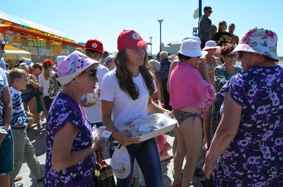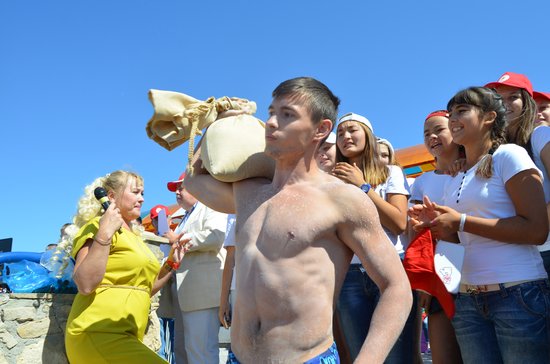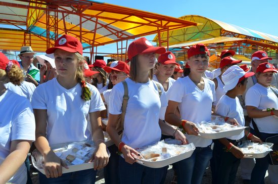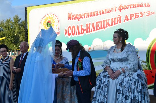 Пуд соли одолеем вместе! 21 августа 2015 года гости X Межрегионального фестиваля «Соль-Илецкий арбуз» стали участниками важного исторического события Соль-Илецкого района и Оренбуржья в целом. В рамках фестиваля состоялось установление нового национального рекорда по массовому поеданию пуда соли. В первый день на стадионе «Юность» зрители сделали первый шаг в этом направлении. Для проведения церемонии установления рекорда на сцену были приглашены Губернатор Оренбургской области Юрий Александрович Берг, гость фестиваля, путешественник с мировым именем Федор Филиппович Конюхов, председатель Законодательного собрания Оренбургской области Игорь Николаевич Сухарев и Глава Соль-Илецкого района Юрий Георгиевич Вдовкин. Официальные лица вместе с сопровождавшими их персонажами, историческими личностями, оставившими свой след в истории Оренбуржья – Царицы Екатерина Вторая, Елизавета Петровна, Первый Губернатор Оренбургской Губернии Иван Иванович Неплюев. встретила всех, как и подобает, хлебом-солью хозяйка соляных копей Соленушка В это время волонтеры на подносах разнесли участникам по 2 грамма соли в пакетиках с логотипом официального свидетельства о признании Соль-Илецка – арбузной столицей России - фестиваль-то арбузный! По команде главного арбитра Российского комитета регистрации рекордов Вадимом Горюновым вскрыты пакетики и дружно всем стадионом (2000 человек) было съедено 4 килограмма соли. Триколорный фейерверк возвестил о завершении первого дня фестиваля. На следующий день, 22 августа, на территории солёных озёр у всех посетителей появился уникальный шанс стать участником яркого события – церемонии регистрации рекорда, достойного книги Гиннеса – поедание Пуда Соли. Каждый из 6000 участников не только получил из рук волонтеров 2 грамма самой лучшей в мире соли - илецкой соли, но и стал обладателем сертификата участника удивительного, единственного в своём роде, исторического события. |
